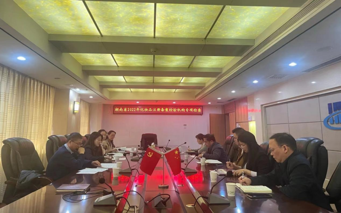 化妆品处陈舒副处长带队,化妆品处姚翔,药品审评中心肖丙燚,汪灿等一行人来我院进行化妆品注册与备案机构能力建设的检查并举行座谈会。省药检院党委书记、院长胡斌,分管副院长黄海萍,以及各相关科室迎接了本次检查。